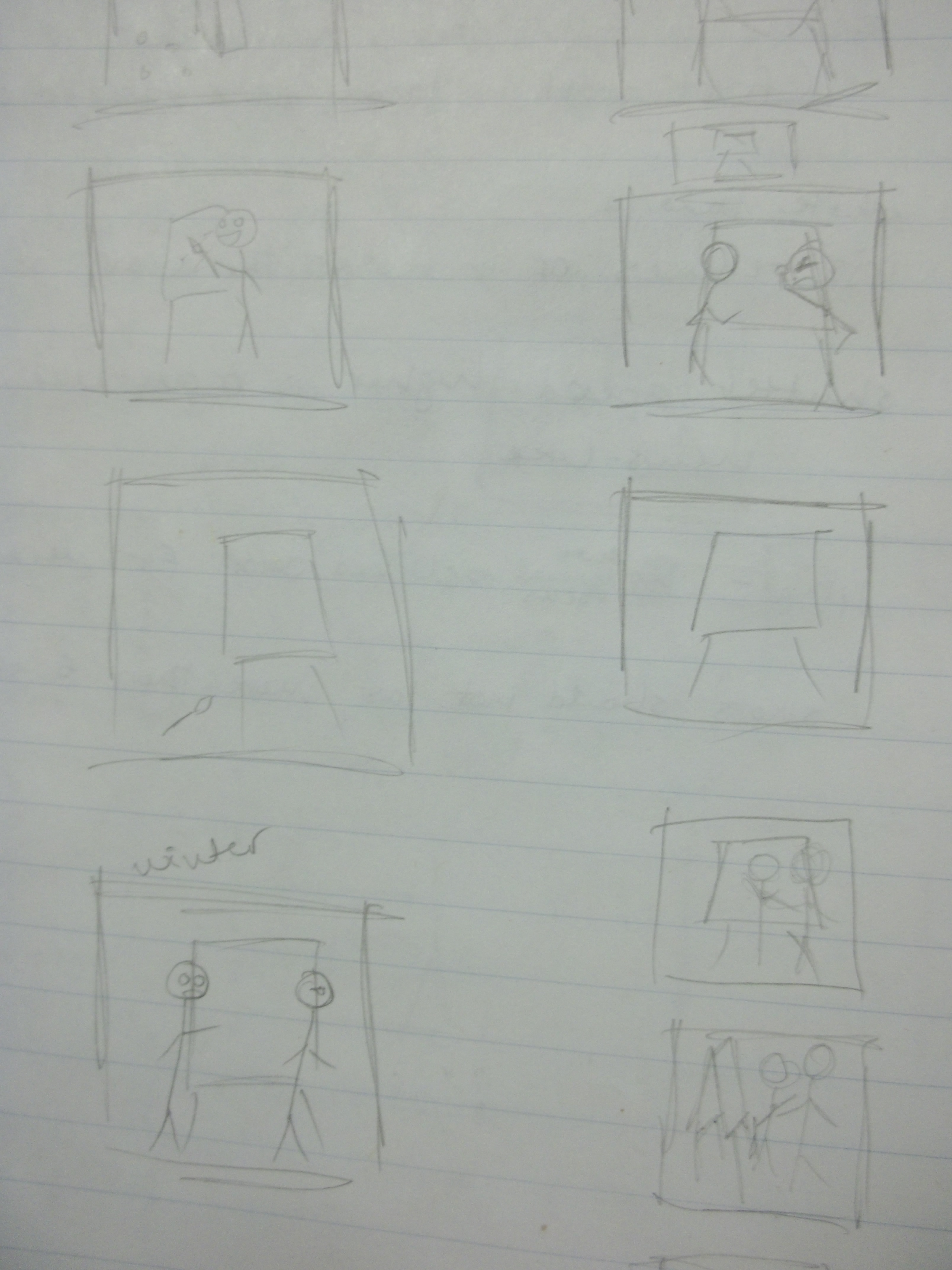There are a lot of things I really wanted to do and a lot of ways in which I found I was limited by time, the poor planning to which I referred earlier, and a definite gap in my camera work/directing skills. Behold, part of my sort-of-storyboard: